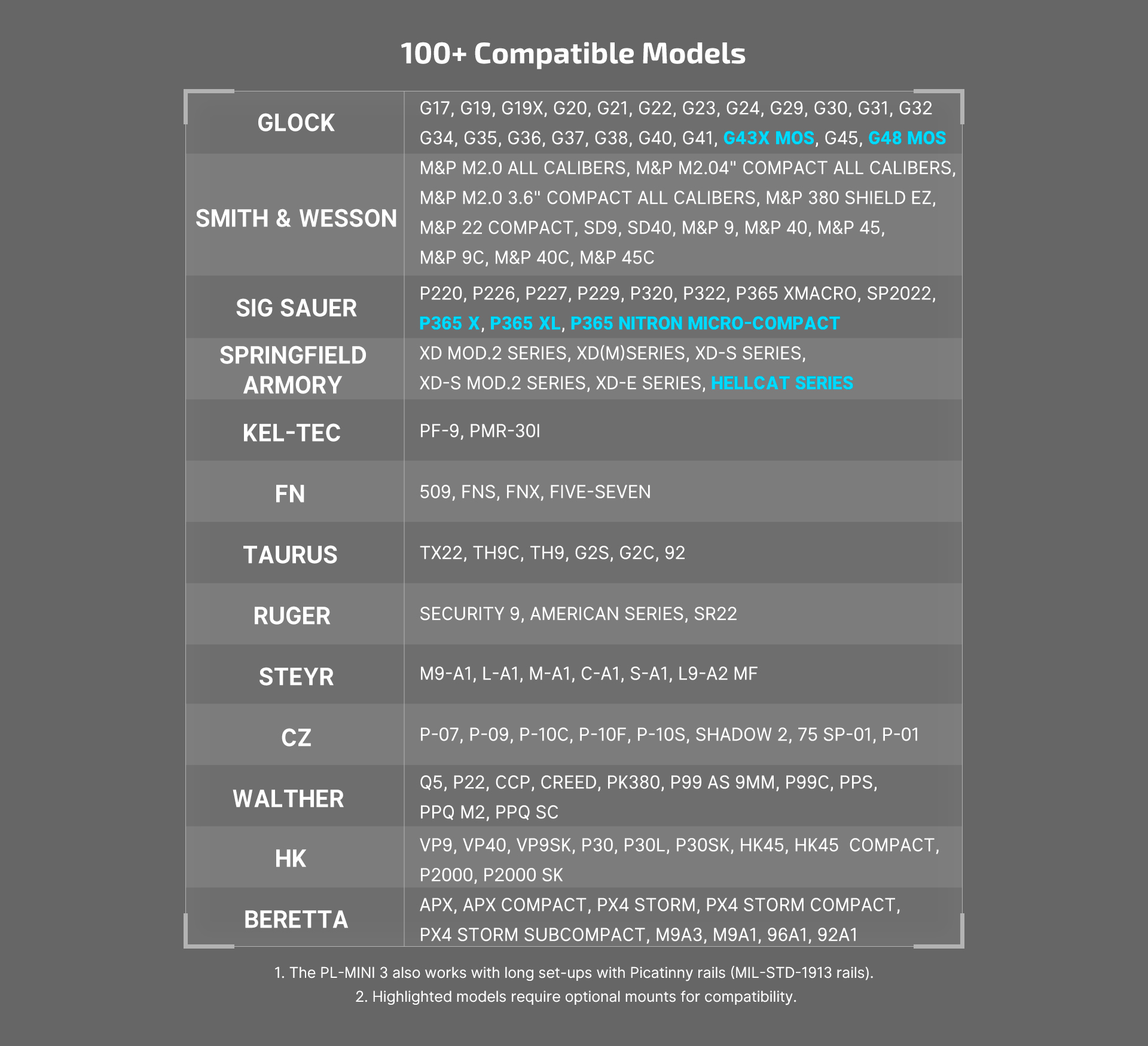 - Superior Versatility: Equipped with a preinstalled Picatinny rail mount, and Hellcat, GL, and 1913 rail adapters, plus optional G43X MOS rail, P365 rail, and quick-release rail, this light reaches new heights of adaptability. (The 3 optional rails will be available next month.)